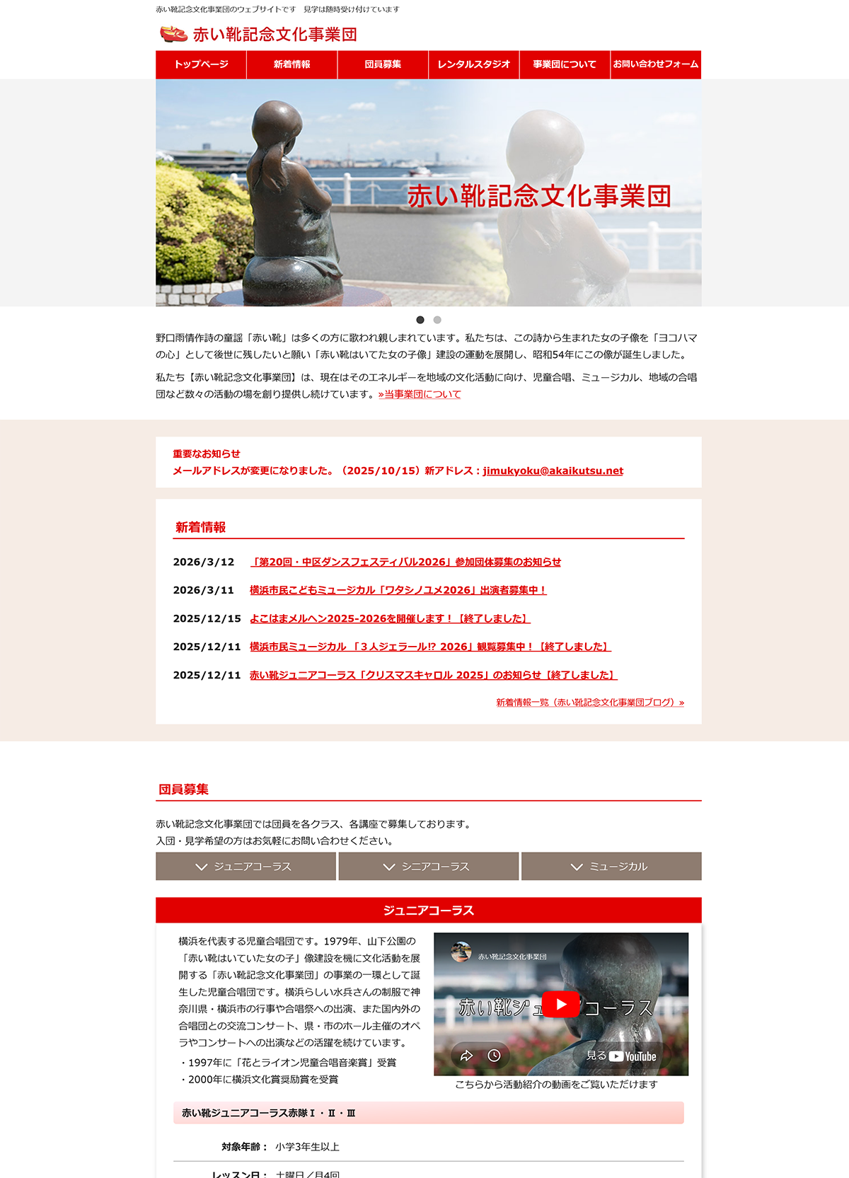 赤い靴記念文化事業団のウェブサイトを制作しました。児童合唱、ミュージカル、地域の合唱団などの活動をしている横浜市の団体です。